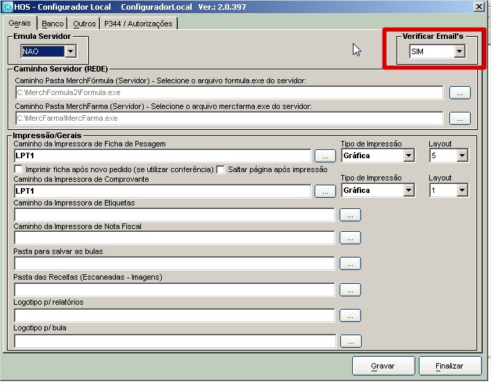 Após essa configuração, é necessário ir no Configurador Local do MerchFórmula, e nas estações que a farmácia deseja utilizar a rotina, a configuração Verificar Emails deve estar = SIM.
