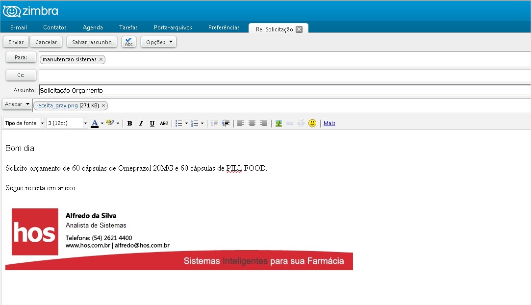Vimos que foi configurado o seguinte Email como sendo da farmácia: manutencao.sistemas@hos.com.br