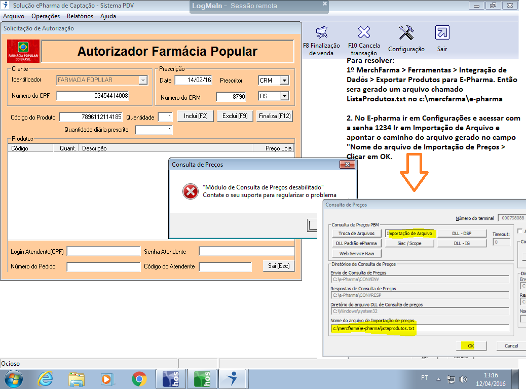 FatoRetorno "Módulo de Consulta de Preços Desabilitado" ao finalizar autorização de Farmácia Popular pelo E-pharma.