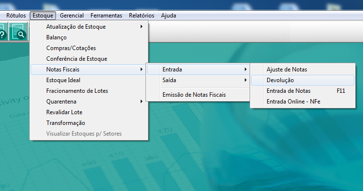 Acessar o menu Estoque >> Notas Fiscais >> Entrada >> Devolução