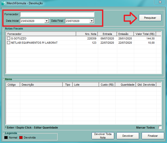 O sistema vai abrir uma tela, como a exibida na imagem abaixo. Nesta tela é possível realizar a pesquisa da Nota de Entrada, informando a Data Inicial e Final. Caso você prefira filtrar por um determinado fornecedor, também é possível. Neste caso, informei apenas o período e cliquei em Pesquisar.
