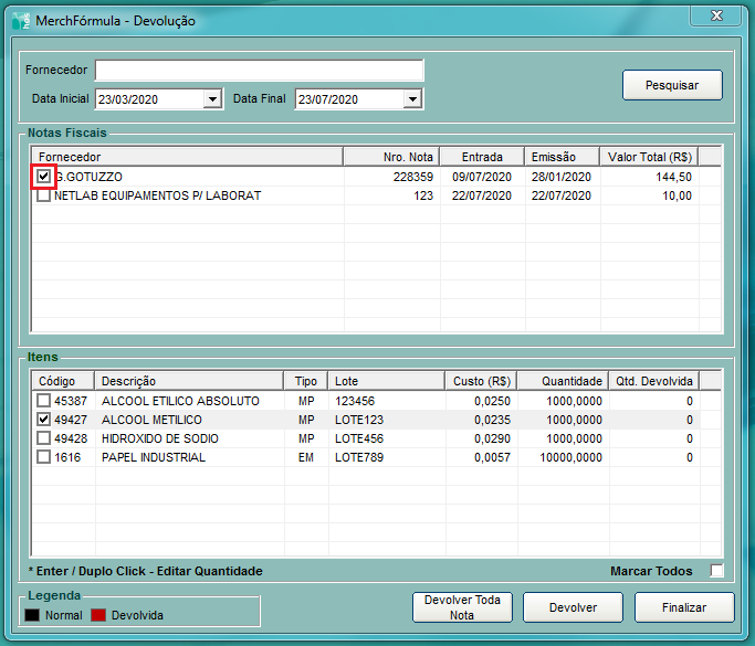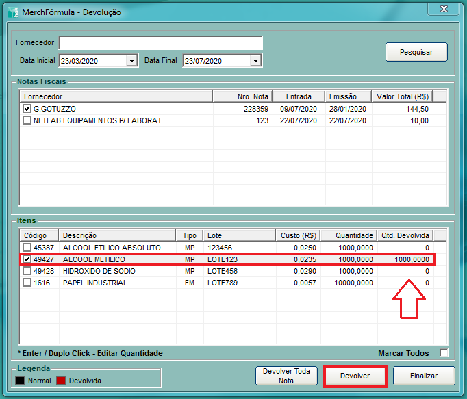 O sistema listou as Notas de Entrada. Marcamos a nota que gostaríamos de devolver, para que o sistema liste os produtos. Neste caso, vamos devolver o Álcool Metilico, código 49427.
