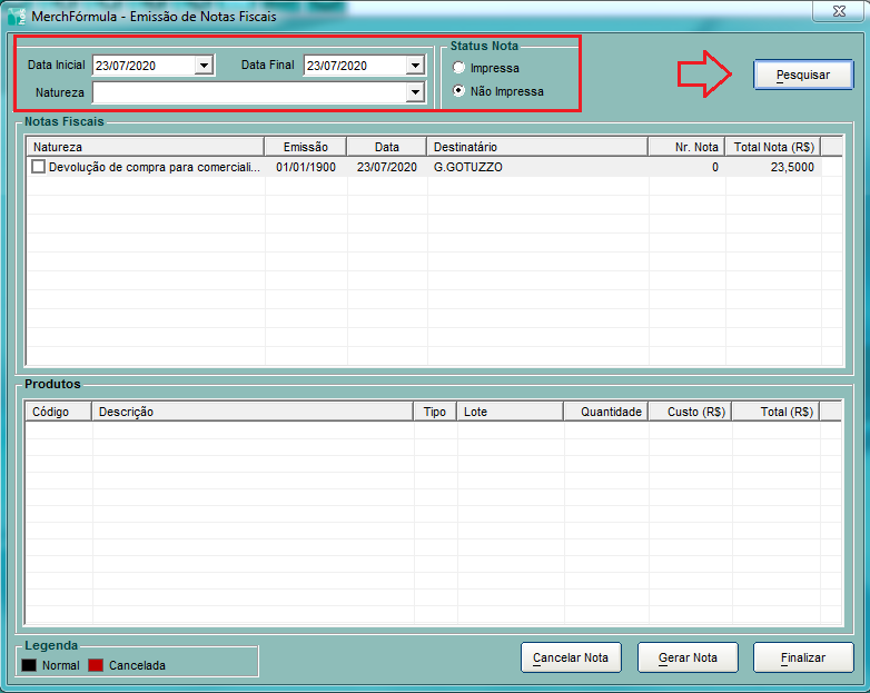 A Natureza de Operação não informamos, pois não temos uma grande quantidade de notas para ser necessário filtrar pela natureza. Clico em Pesquisar.