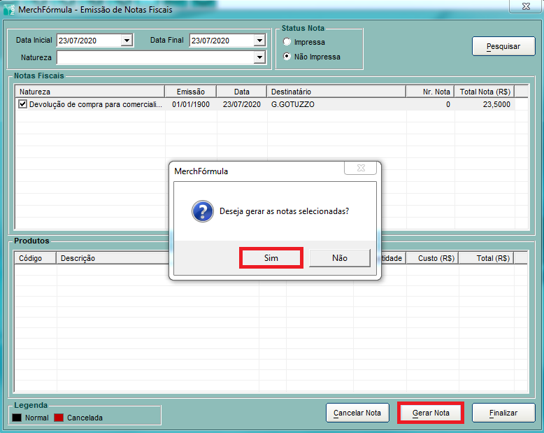 Como nós não geramos a nota ainda, no Status deixamos como Não impressa.
