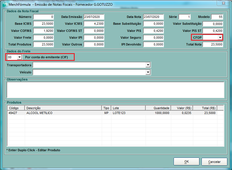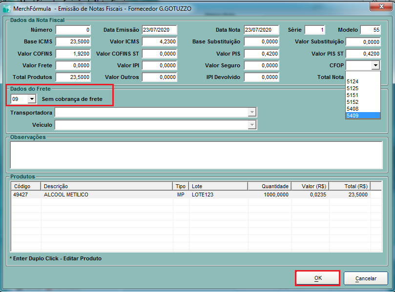 Será aberta outra tela como a tela abaixo, nela pode ser ajustado o Frete e deve ser informada uma CFOP, clicar em OK.