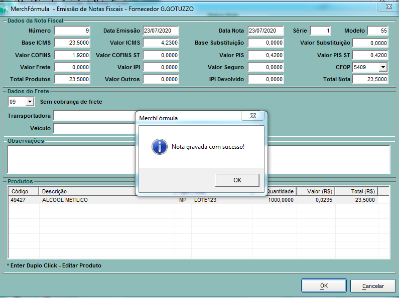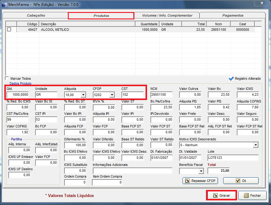 Ajustados os dados, clicar em Gravar e depois realizar o envio da nota ao Sefaz