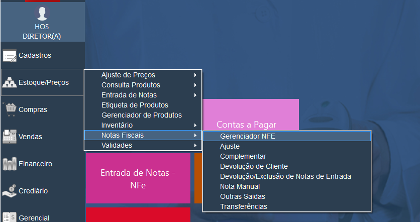 Agora no HOSFarma >> Estoque/Preços >> Notas Fiscais >> Gerenciador de NFe.