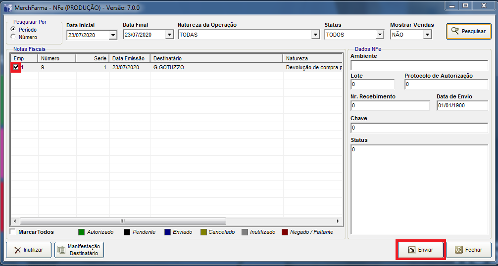 A nota irá aparecer disponível para o Envio. Antes de enviar, ela pode ser editada para conferir os dados como por exemplo CFOP, CST, Frete e possíveis observações.