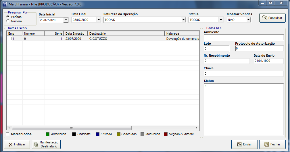 O sistema abrirá uma tela, como a exibida na imagem abaixo. Nela é possível filtrar as notas, pela Data, pela Natureza de Operação e Status.