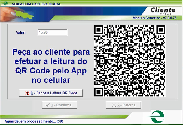 - A transação no frente de caixa da farmácia ocorrerá de forma praticamente idêntica a uma transação com cartão de crédito/débito onde, na finalização da venda, escolhe-se a opção Cartão para realizar o pagamento e, a partir daí, o SITEF assume a operação. Na configuração do SITEF a ser realizada pela Software TEF, será criado um novo botão chamado Carteiras Digitais, opção que deve ser utilizada para a transação com PIX. A partir do acionamento desse botão, o SITEF conduzirá a operação, solicitando a escolha de qual carteira digital será utilizada no pagamento, bem como opção de QRCode. Ao finalizar, será apresentado, pelo SITEF, o QRCode que deve ser lido pelo aplicativo do cliente comprador. Ao ler o QRCode, a transação se realizará através do aplicativo do banco do cliente, que deverá mostrar ao operador do caixa o resultado da transação, para que este assegure que a operação aconteceu e o dinheiro será transferido para a conta da farmácia.