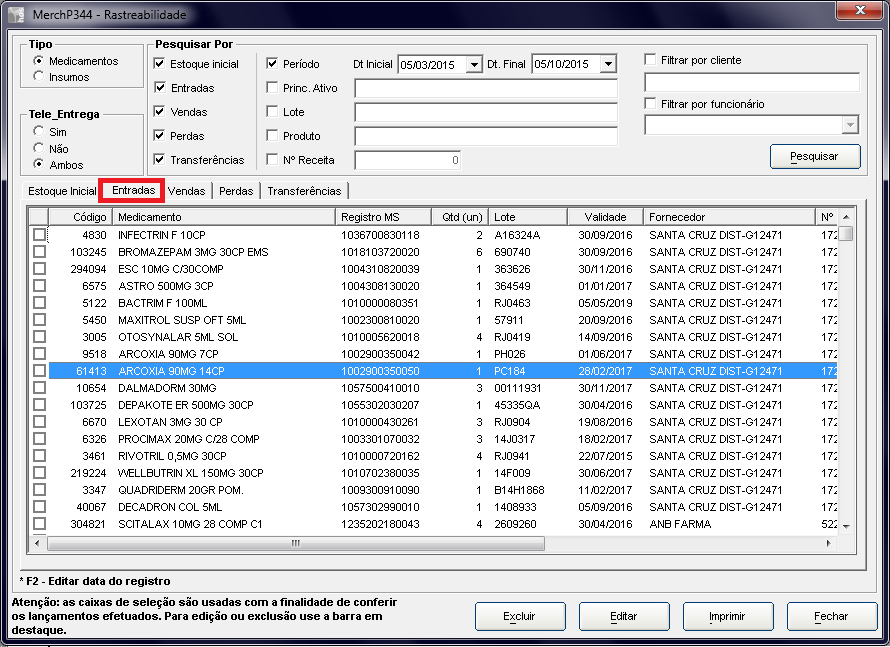 Logo após, clique na aba entradas, onde serão exibidas as que foram feitas nos período escolhido. Clique nas entradas nas quais deseja executar uma ação.
