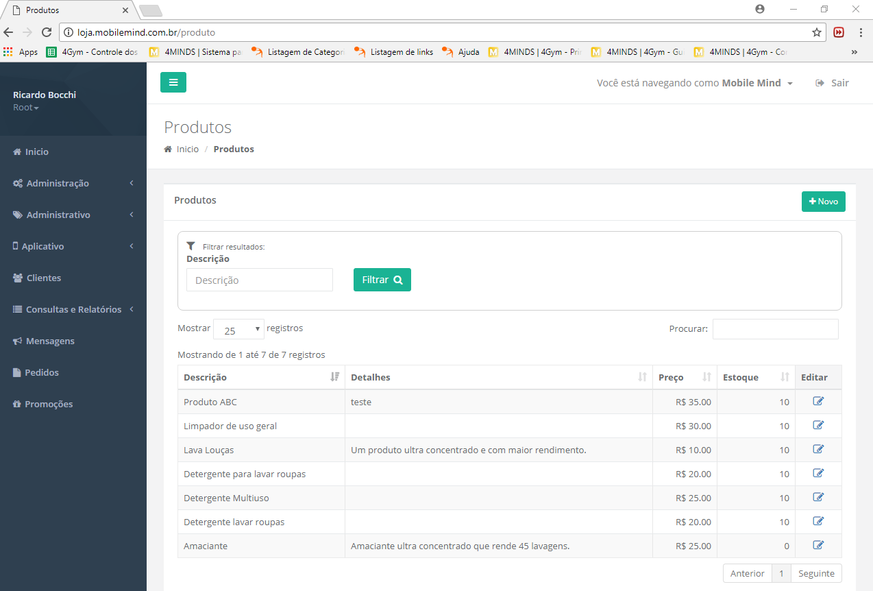 Na tela principal temos acesso a lista de produtos já cadastrados com o preço e quantidade em estoque. Lembrando que só aparecerá a quantidade em estoque se os mesmos forem cadastrados e se a configuração "Permite estoque negativo" estiver como "Não". Para alterar algum dado é só clicar no ícone em "Editar".