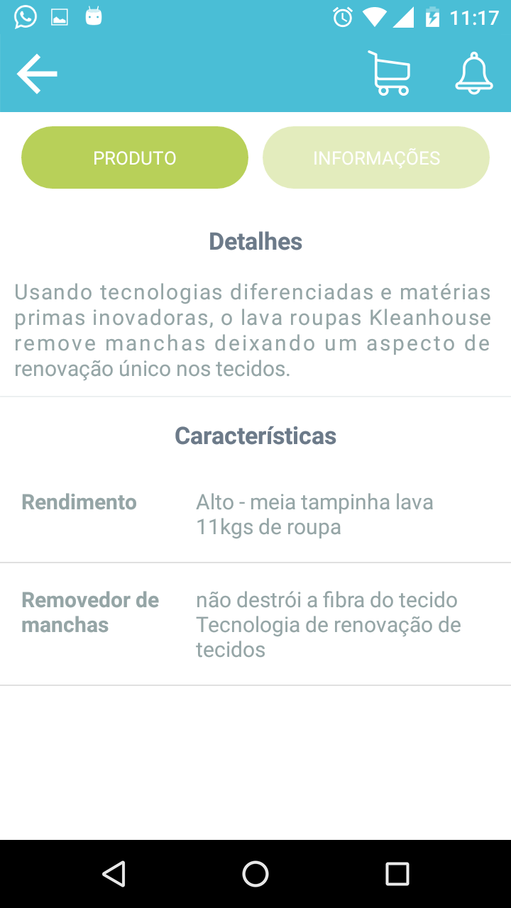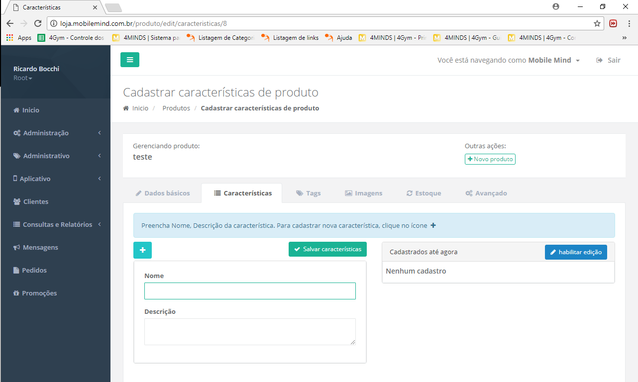 Na aba "Características" você pode cadastrar as características dos produtos, como peso, tamanho, rendimento, etc.