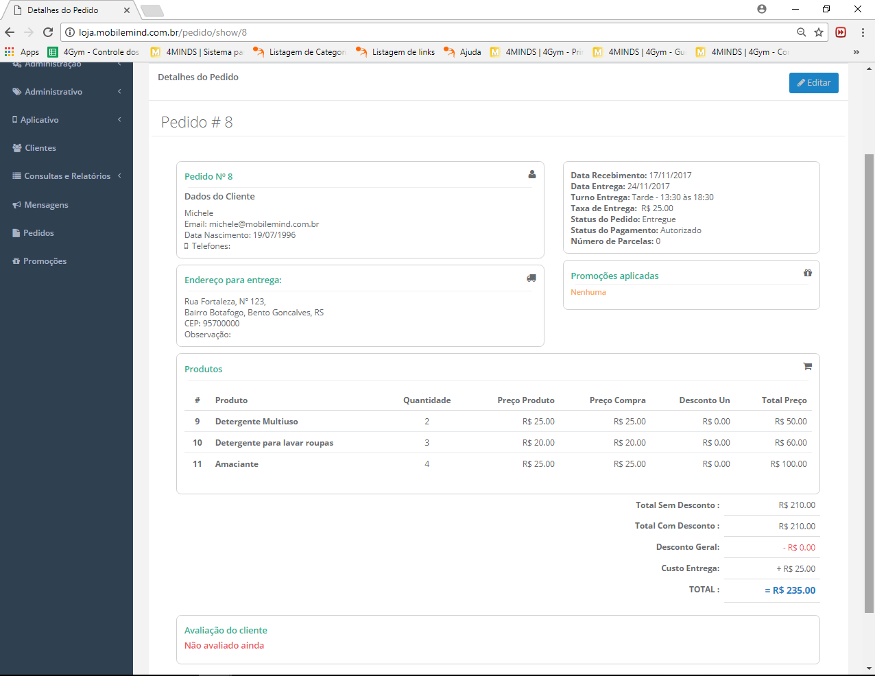 7. 1 Na opção "Visualizar", será exibido algumas informações, como: os dados do cliente, dados do pedido, endereço de entrega. Abaixo está a descrição de todos os produtos com os detalhes, promoções, valor de frete, total da compra, etc. Você também poderá verificar a avaliação do cliente neste mesmo menu.