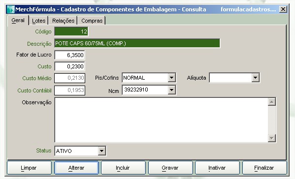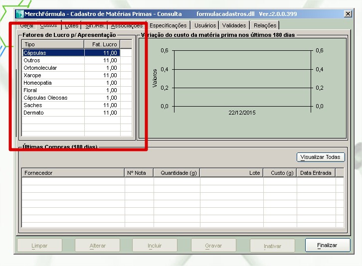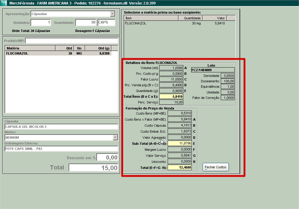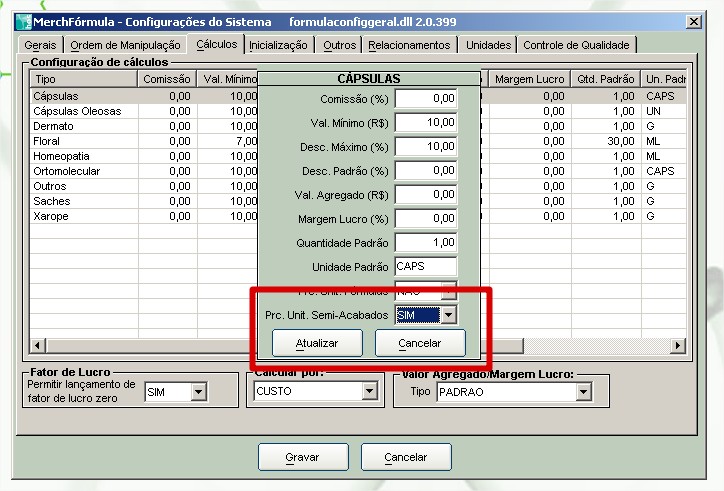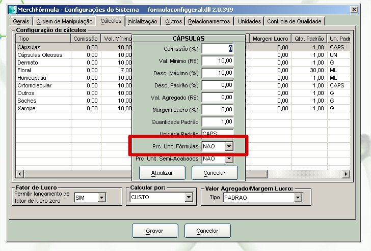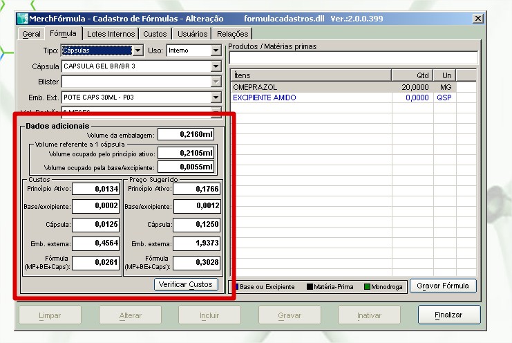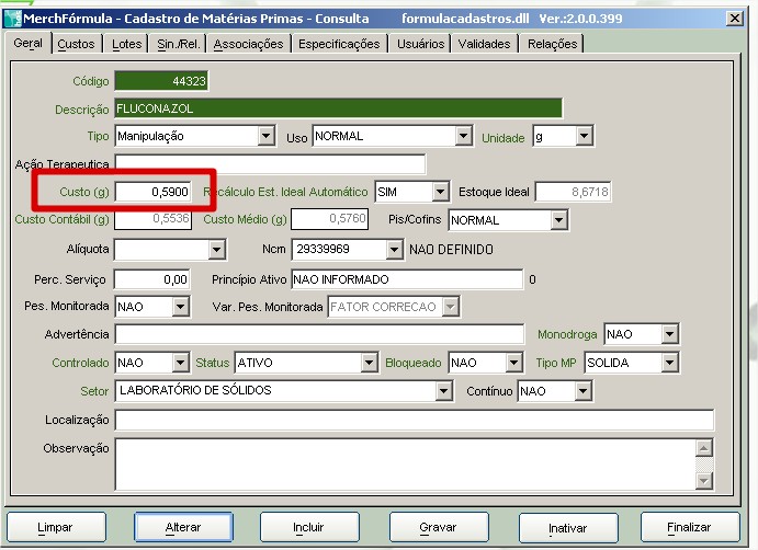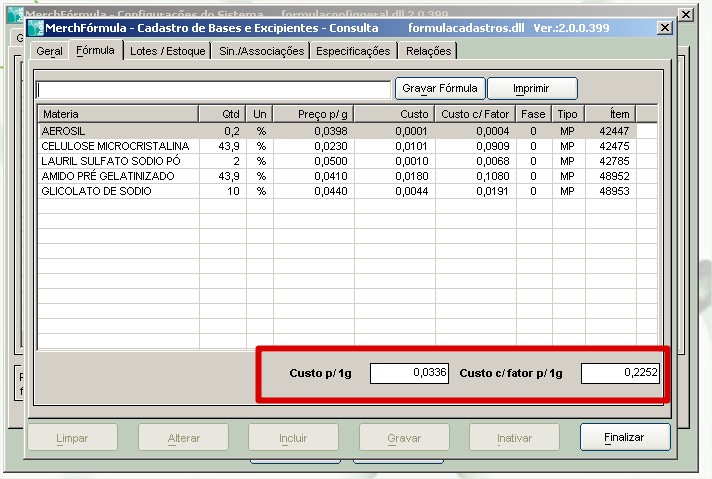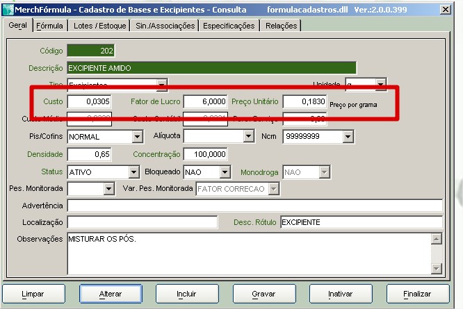 4. Com isso o sistema calculará o preço de custo baseado na formulação da base/excipiente e não no valor do cadastro.