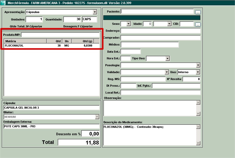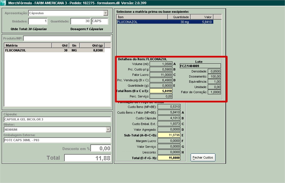 Se a quantidade MP necessária para manipular a fórmula do cliente é 0,9g, logo o sistema calculará da seguinte maneira: 0,9 * 6,49 = R$ 5,84.