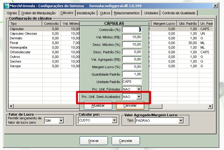 Caminho: Ferramentas/Configurações/Gerais/Cálculos = Essas configurações são por Apresentação (Forma Farmacêutica).