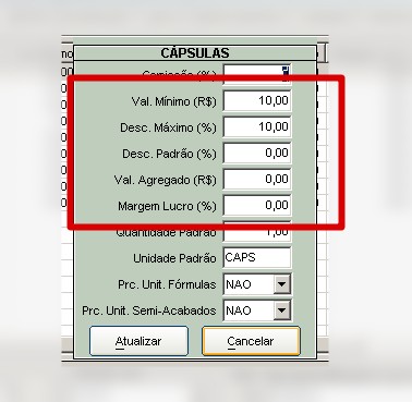Val. Mínimo (R$): Serve para que o sistema cobre um valor minimo para uma determinada Apresentação. Por exemplo, todas as minhas fórmulas de cápsulas possuem um valor mínimo de R$ 15,00.