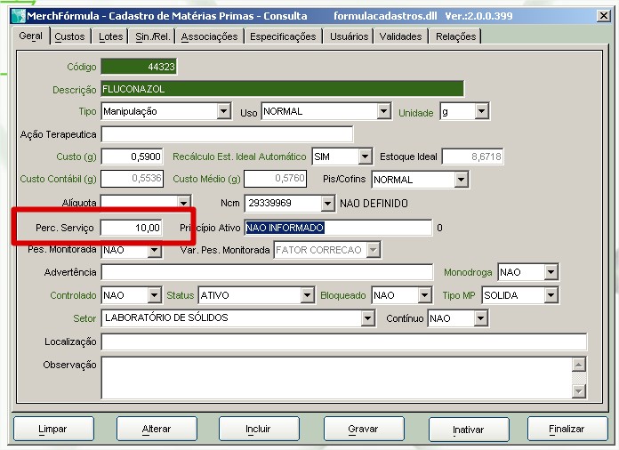É possível incluir um Percentual de Serviço em cada insumo existente na farmácia. Esse percentual serve para que a farmácia consiga colocar na formação de seu preço de venda um percentual, baseado na dificuldade de manipulação de cada insumo. Observe a imagem abaixo do Fluconazol.