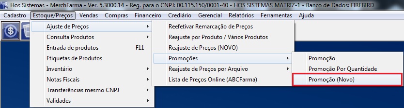Solução1. HOS Farma > Estoque/Preços > Ajuste de Preços > Promoções > Promoção (Novo)