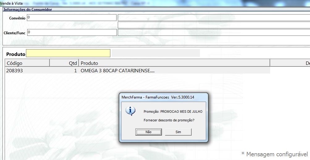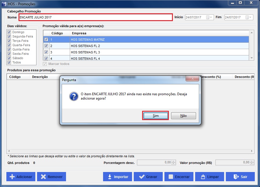 Caso o sistema não encontre o nome da promoção pesquisada, ele vai pedir se você deseja cadastrar uma promoção. Caso ele encontre, o sistema vai mostrar os produtos que estão naquela promoção.