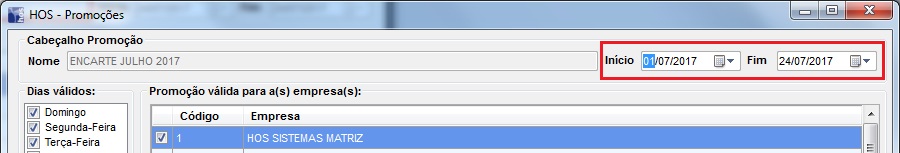 Dias válidos: São os dias da semana em que a promoção vai estar ativa, caso você defina que somente na quarta-feira o Omega 3 vai estar com 15% de desconto, você deixa somente a quarta-feira marcada e os demais dias desmarcados.