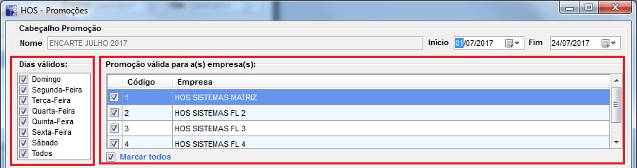 . Selecionar os dias da semana em que ela vai valer, depois para quais empresas ela é válida
