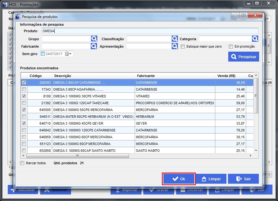 Marcar os produtos que deseja incluir na promoção e clicar em OK