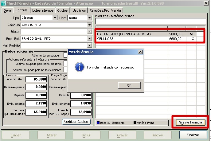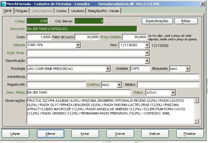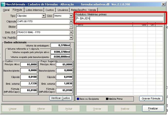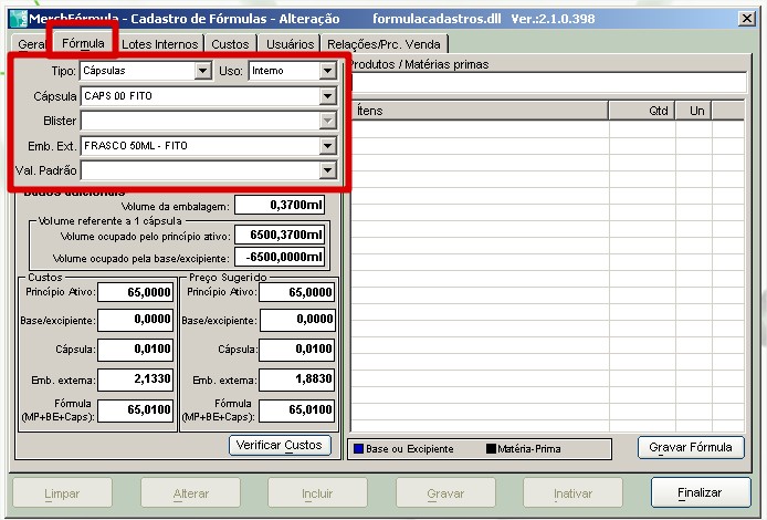 Val.Padrão: Se houver uma validade padrão que queiram colocar para as fórmulas de cápsulas. Deve ser cadastrada no cadastro de validades.