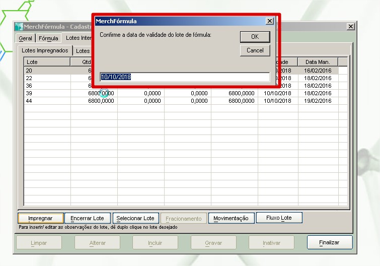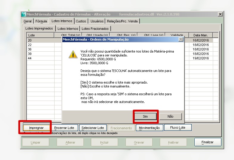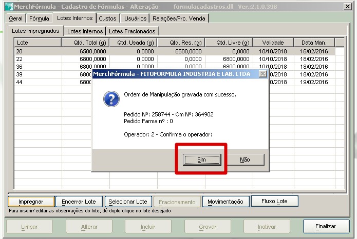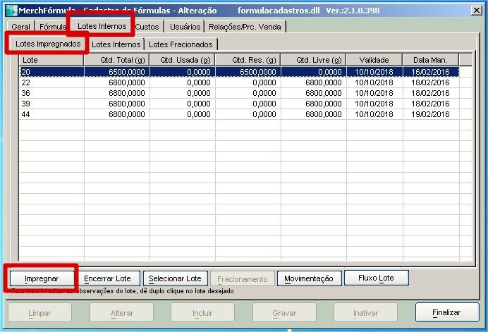Quando é cadastrado uma fórmula com o tipo = Cápsulas, o sistema habilita um botão Impreguinar e uma nova aba de Lotes Impreguinados. Observe as imagens abaixo: