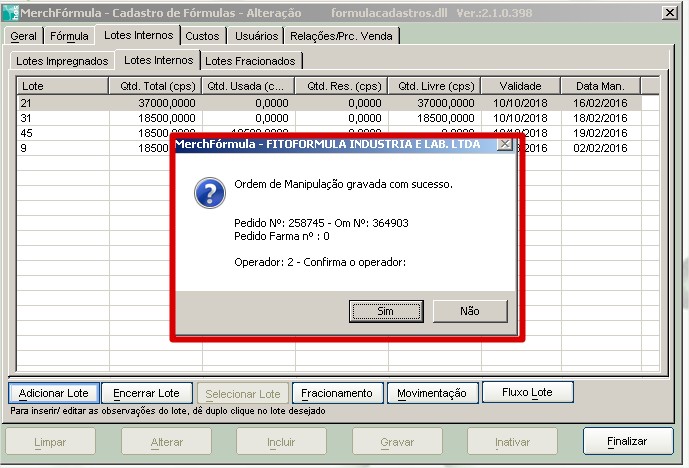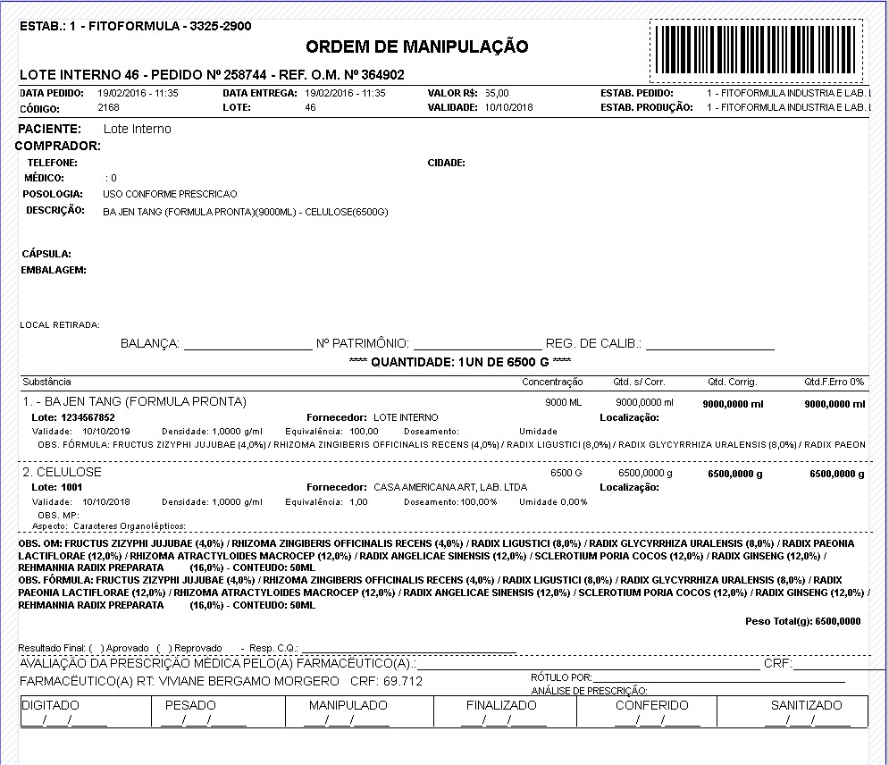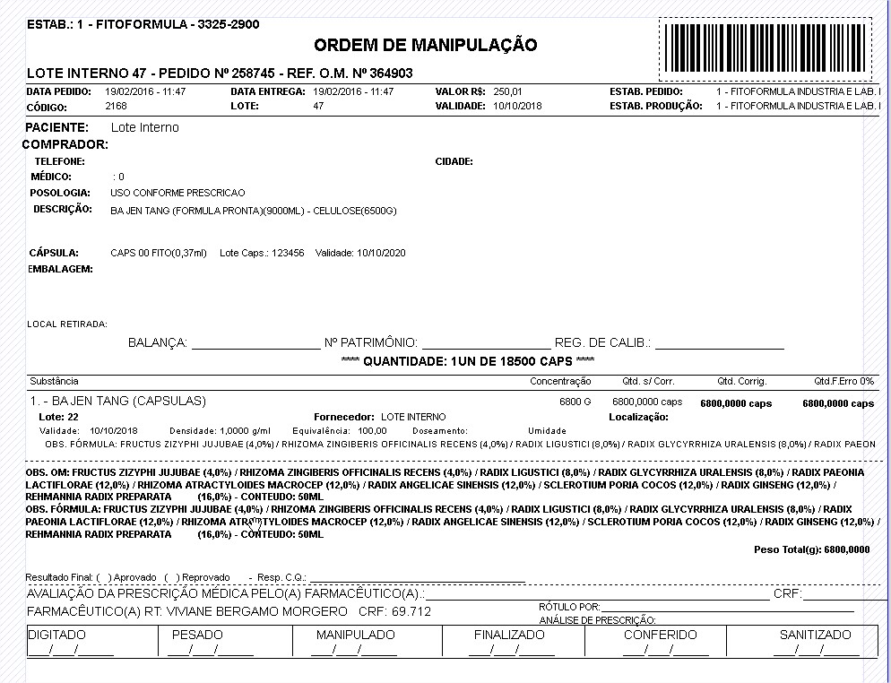 O sistema irá gerar uma ficha de pesagem para a produção do lote interno de cápsulas.