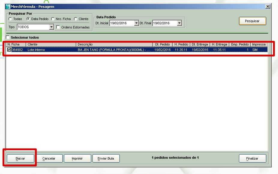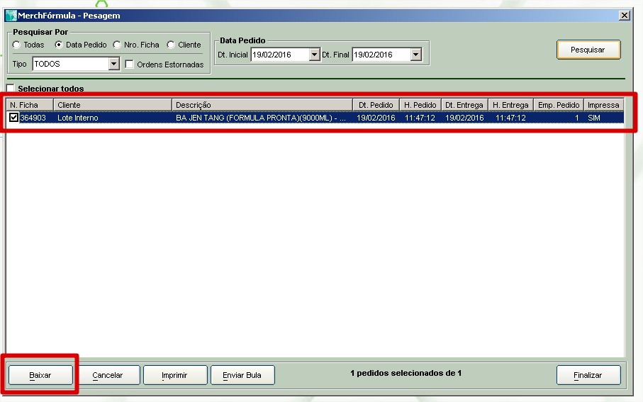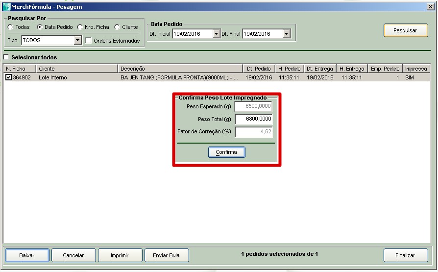 Após isso, é necessário ir na rotina de Ordens Pendentes, realizar a baixa dessa ficha (que seria referente a informar ao sistema que o lote de impreguinação está produzido) e informar o peso final do lote para que o sistema calcule o fator de correção. Observe a sequencia de imagens: