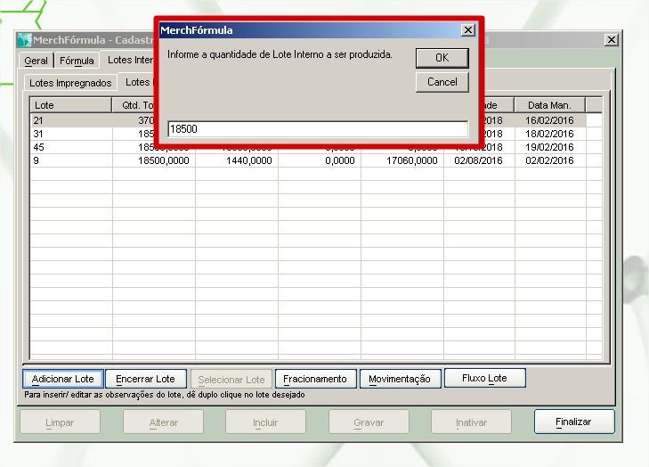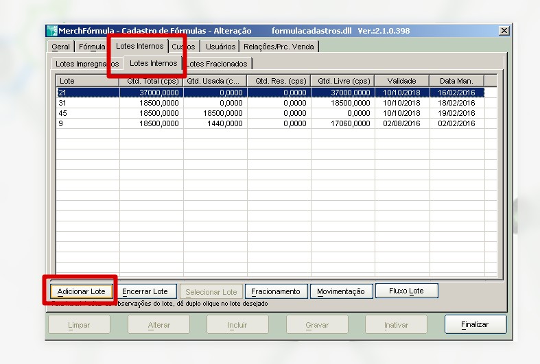 Com o processo de Impreguinação completo, agora temos que gerar o lote interno para o encapsulamento do pó do lote nas cápsulas. Para isso, é necessário acessar o Cadastro de Fórmulas novamente, na aba Fórmulas, aba Lotes e Aba Lotes Internos e Adicionar um novo lote interno. Observe as imagens abaixo: