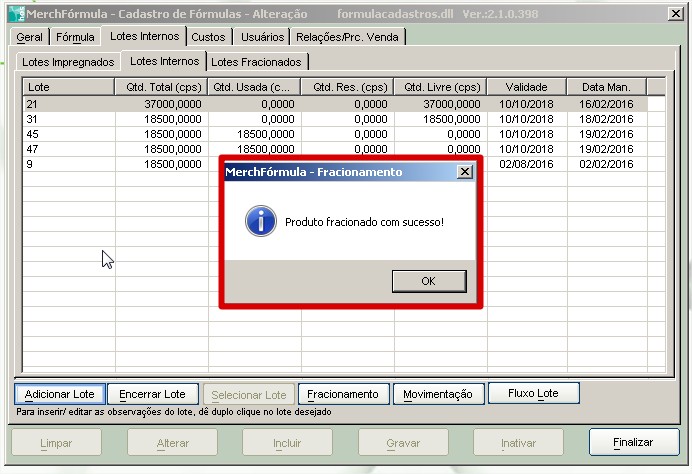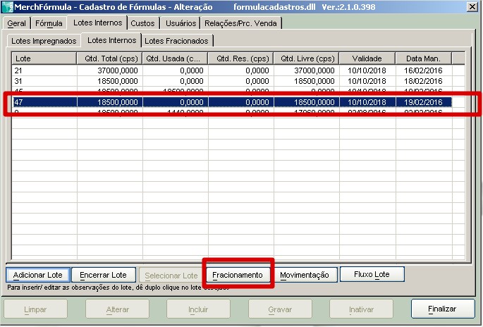 Finalmente é necessário realizar o processo de fracionamento das cápsulas (dividir as cápsulas em potes com 60 cápsulas cada). Para isso é necessário utilizar a rotina do Fracionamento. Observe as imagens abaixo: