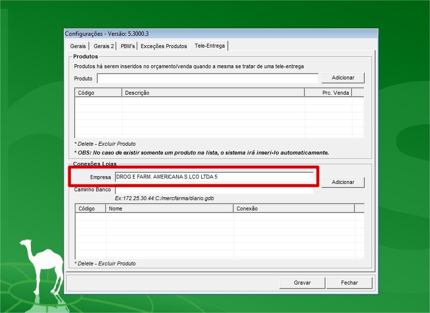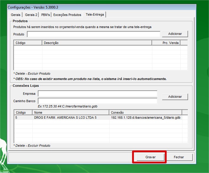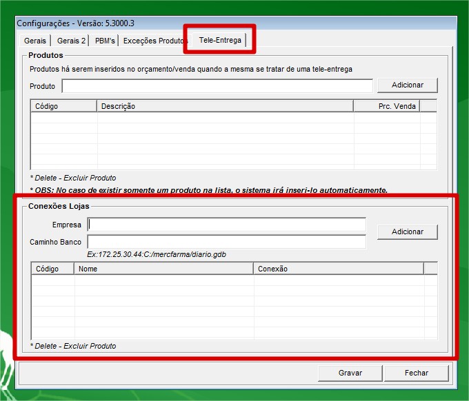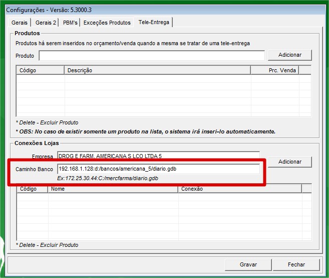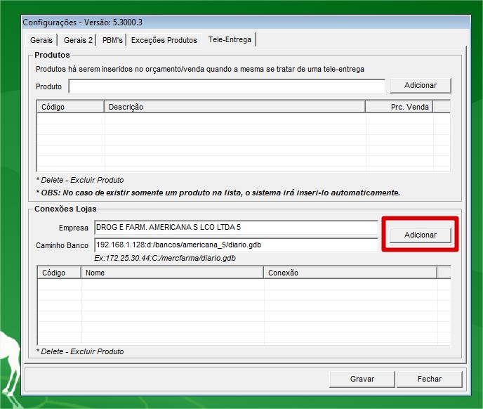 2. No Grupo Conexões Lojas, é onde vamos cadastrar o código das lojas e o caminho do banco diario.gdb da loja que será a recebedora dos pedidos (orçamentos) de tele entrega. Observa as imagens abaixo: