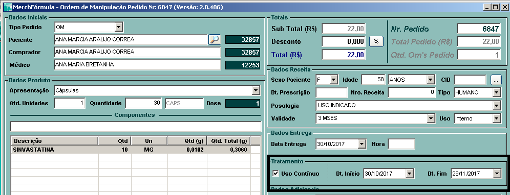2º Ao realizar o pedido para o cliente através de uma Nova Ordem de Manipulação o sistema vai mostrar a tela conforme imagem abaixo, onde vai mostrar a opção de Uso Contínuo já marcada. Dependendo da quantidade de cápsulas escolhida o sistema já muda a data final, no exemplo abaixo pedimos 30 cápsulas com isso as datas ficaram 30/10(início) e 29/11(fim) se mudar para 60 cápsulas o sistema mudará a data fim automático para 20/12. Se caso a receita não for de uso contínuo basta desmarcar a opção na própria tela do pedido e com isso sistema não vai armazenar a receita.