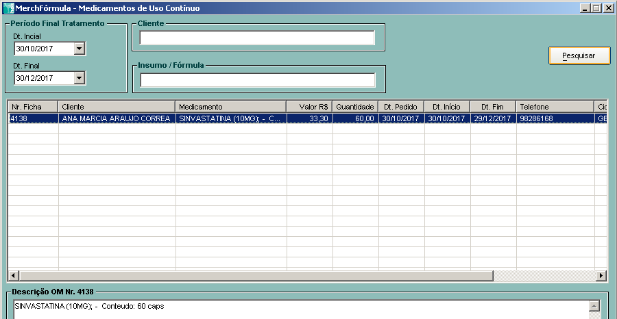 3º Após as informações lançadas pela ordem de produção é possível gerar relatórios para ver os clientes com uso contínuo lançado, essa informação fica no caminho Atenção Farmacêutica--> Uso Contínuo