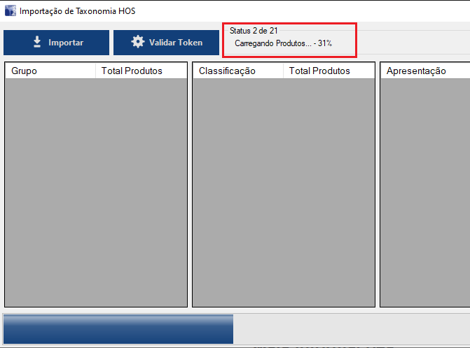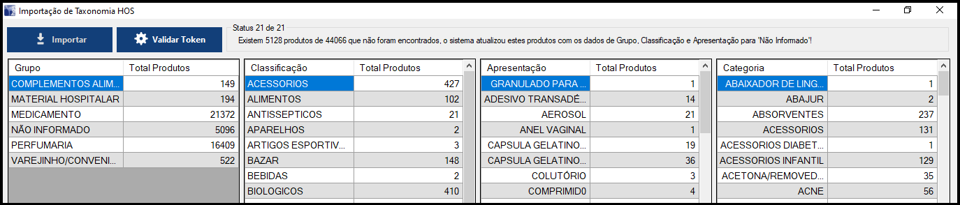Após finalizar, o sistema mostrará quantos produtos existem em cada Grupo, Classificação, Apresentação e Categoria.