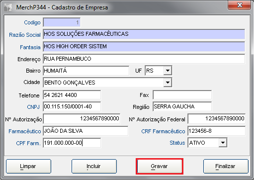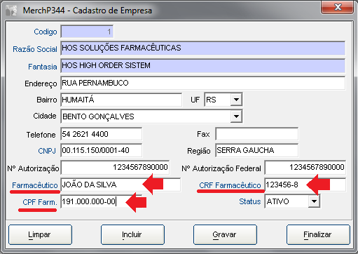 *OBS.: Atenção aos dados do Farmacêutico, pois estes dados serão enviados ao SNGPC na transmissão do arquivo XML, essa informação deve ser condizente com o cadastro no portal do SNGPC.