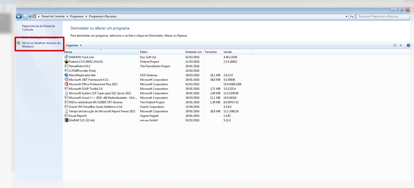 1. Ir no seguinte caminho: Painel de Controle/Remover Programas e Recursos/Ativar ou Desativar Recursos do Windows.