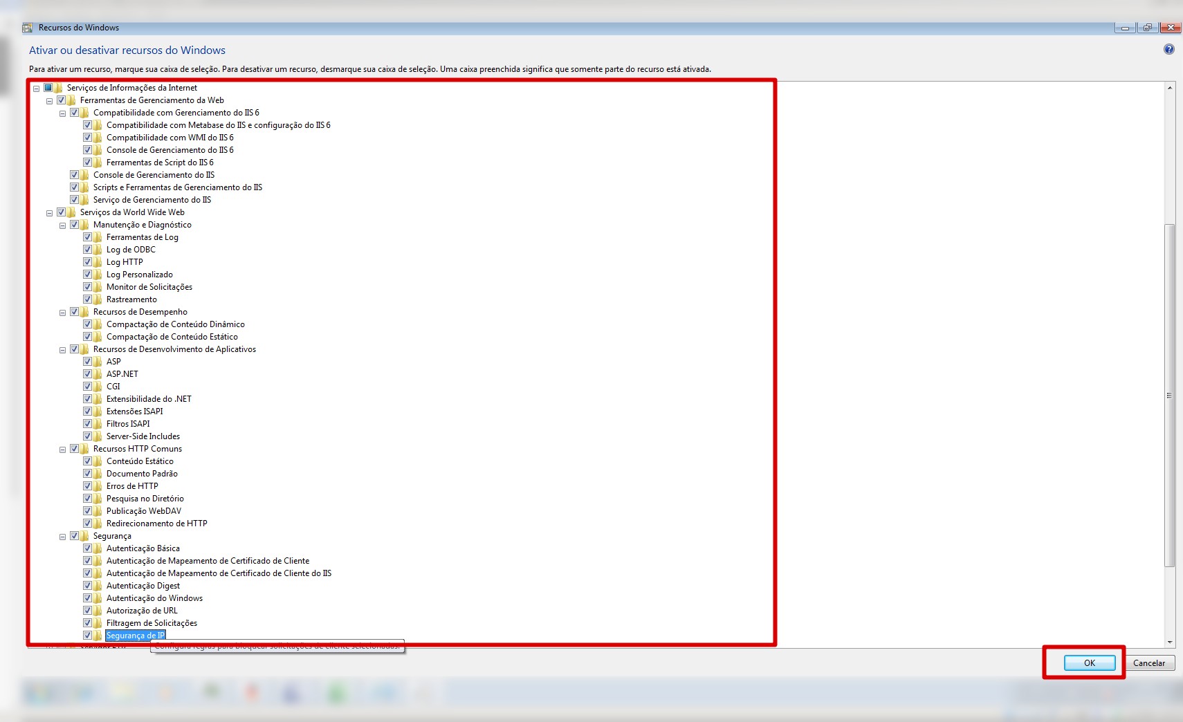 2. A imagem é abaixo é referente a instalação e configuração do IIS no Windows 7 (No Windows Server 2008 e Windows Server 2012 a instalação é similar). Marcar TODAS as opções conforme imagem.