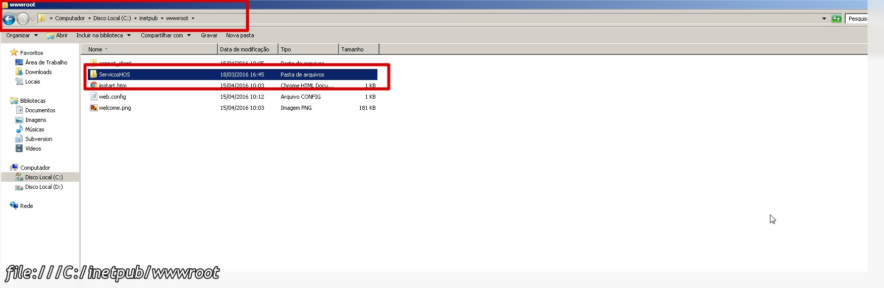 3. Após a instalação do IIS, é necessário fazer a sua configuração juntamente com o WebService. A primeira coisa é colocar os arquivos do WebService na pasta inetpub. Observe as imagens abaixo: