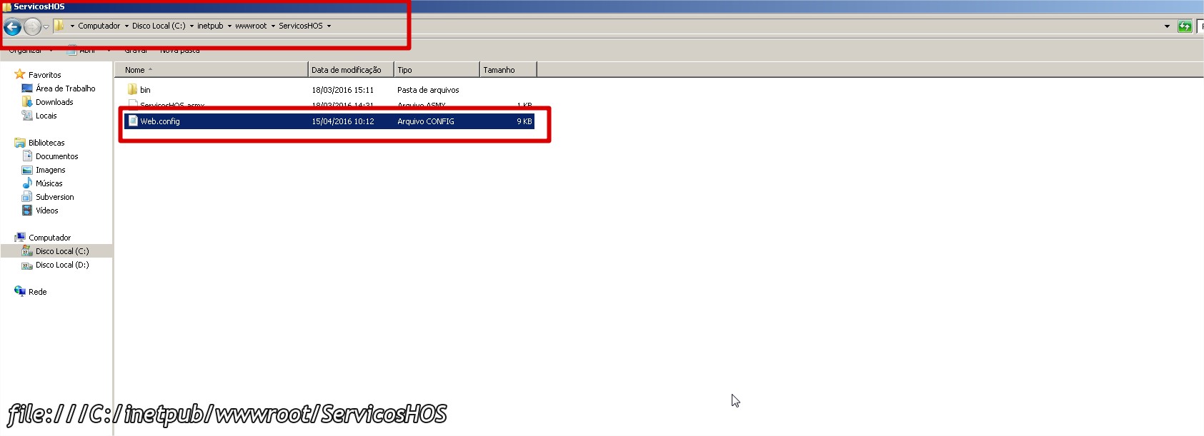 4. Após isso, é necessário ir na pasta dos arquivos do WebService e editar o arquivo do WebConfig com o IP e o caminho do BD. Observe as imagens abaixo:
