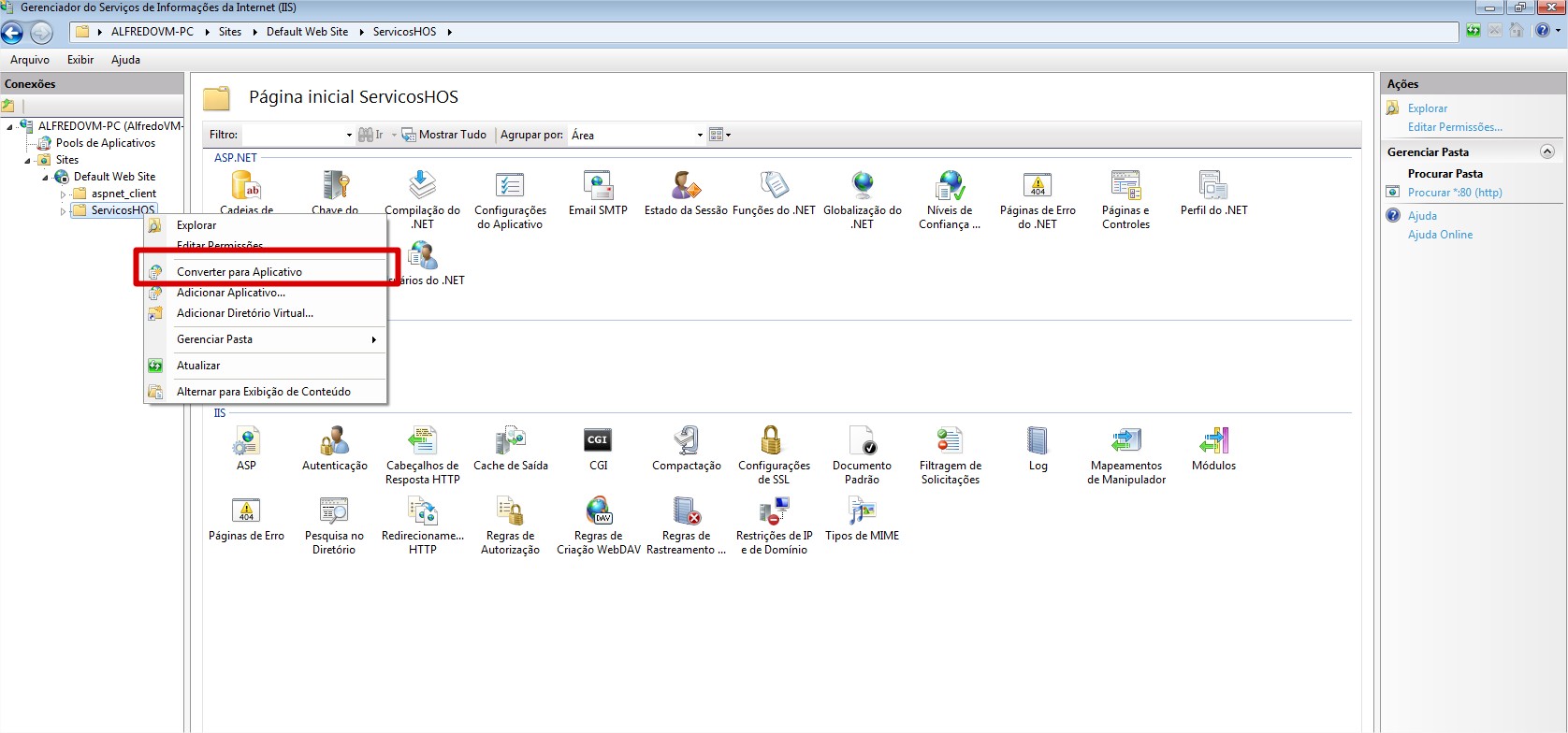 5. Após os processos abaixo, é necessário realizar a configuração do IIS. O primeiro passo é converter o WebService ServicosHOS para um aplicativo. O processo deve ser realizado com o IIS parado. Observe a sequencia de imagens: