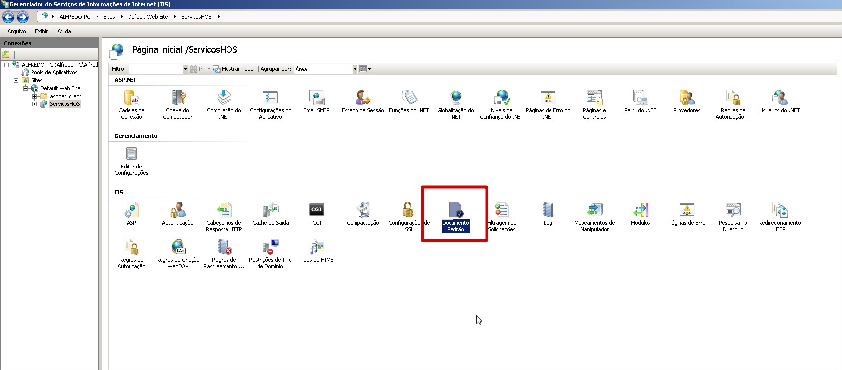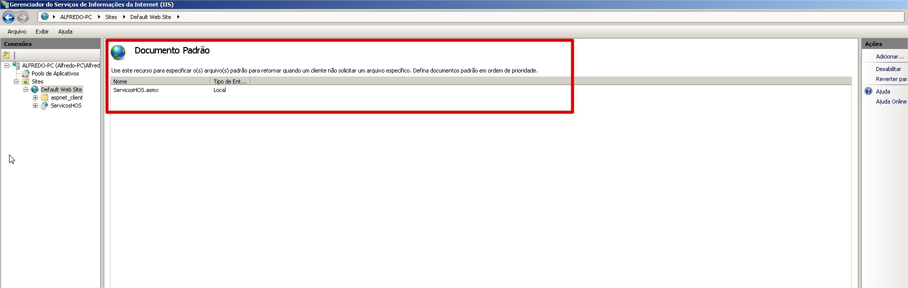 6. Após isso é necessário ir em Documento Padrão, excluir todos os registros e Adicionar somente um com o nome: ServicosHOS.asmx.