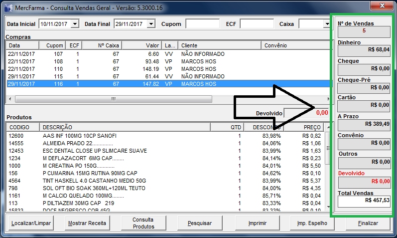 6 - No lado direito da tela, podem ser vistos os totais de venda.