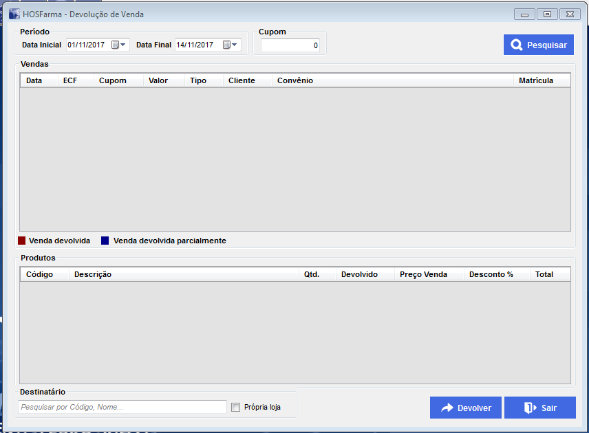 1 - Pesquisar venda. A pesquisa pode ser realizada por intervalo de data ou número de cupom.