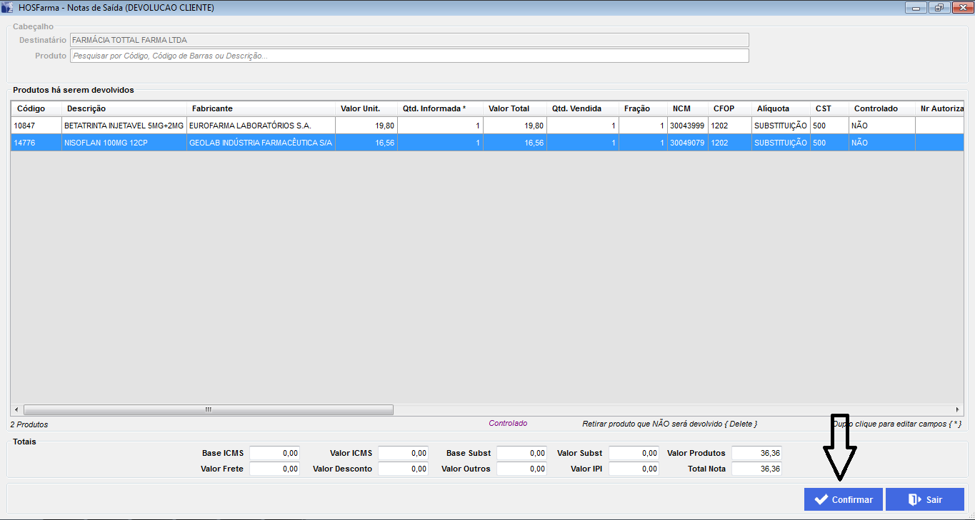 5 - Se existem prododutos na venda que não serão devolvidos, seleciona-lós e realizar a exclusão deles precionando a tecla 'Delete'.