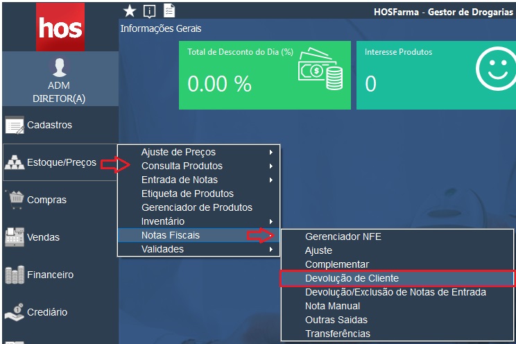 Acessar o menu: Estoque/Preços -> Notas Fiscais -> Devolução de Cliente
