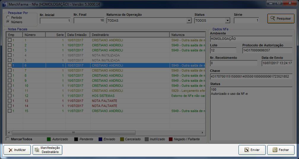 ENVIAR: Enviar a NFe à Sefaz, autorizar a nota;